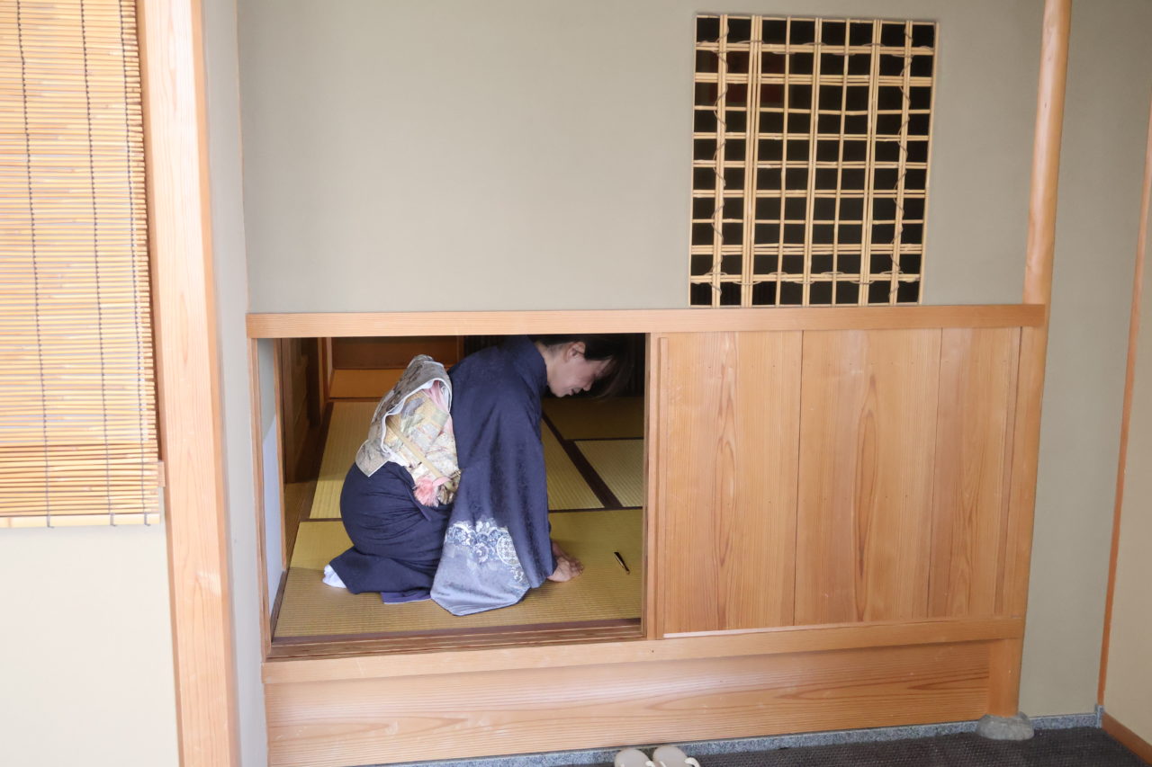 お茶室への躙り口から入る体験もできますよ。