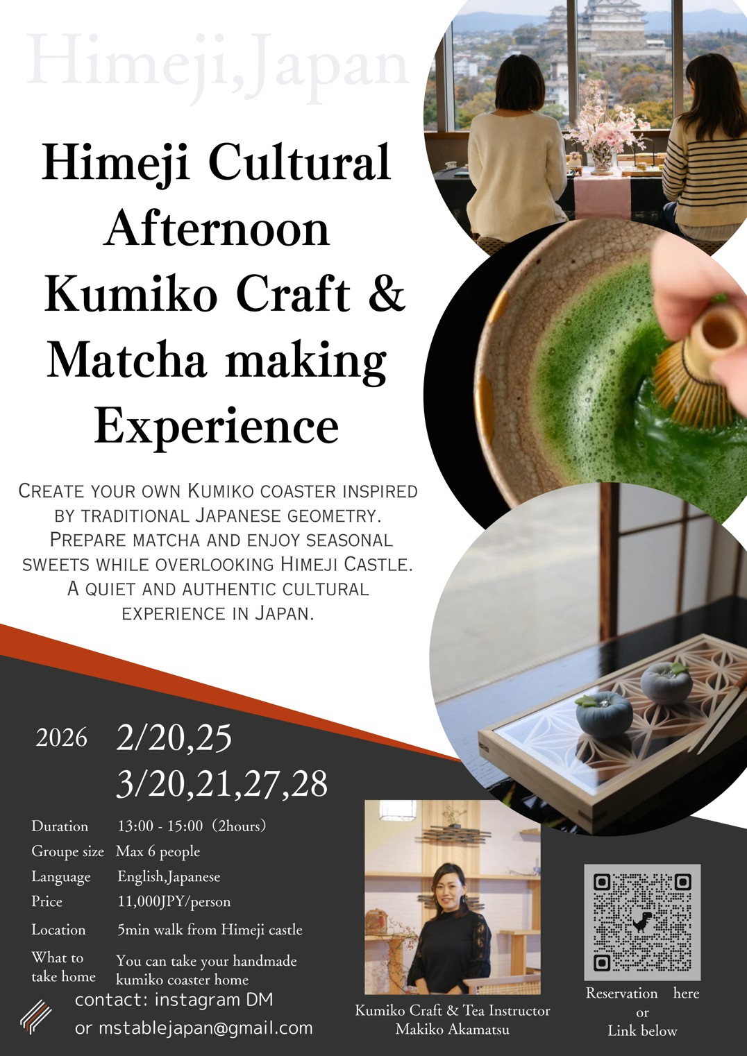 リクエスト開催、貸切りも可能です。(約2時間)13~15時予定 *11:00~15:00の中で、レッスン可能です(2H) 特に3月中旬から4月初旬は桜の姫路城は人気です。お早めに。